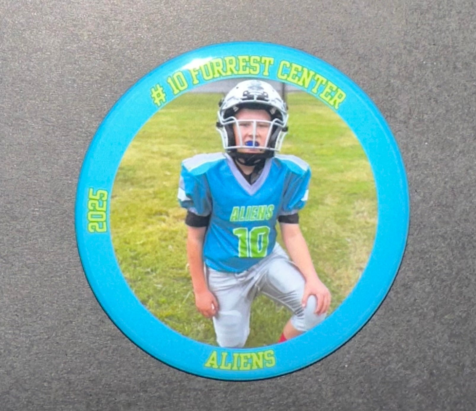 Show off your favorite player with this 2.25" photo button. Available with custom name, number and team name or leave as photo only.